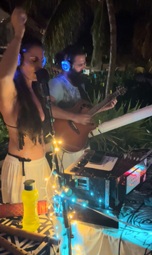 Sus ceremonias públicas están siempre abiertas para que te acerques y puedas co crear con ella. Han colaborado muchos músicos de manera espontánea y casual asi como otros que se han hecho parte del proyecto incluso por años, como el caso de Lalo Valdez, con quien durante mas de 3 años sostuvieron una ceremonia que fue emblematica en Bacalar y juntos fueron pioneros y sembraron en el lugar los conciertos de música medicina, ceremonias temáticas, rituales, kirtan, dejando una huella profunda de la música holistica/espiritual en la comunidad. Crearon tambien SILÊNTIA, una ceremonia de luna llena con audifonos,